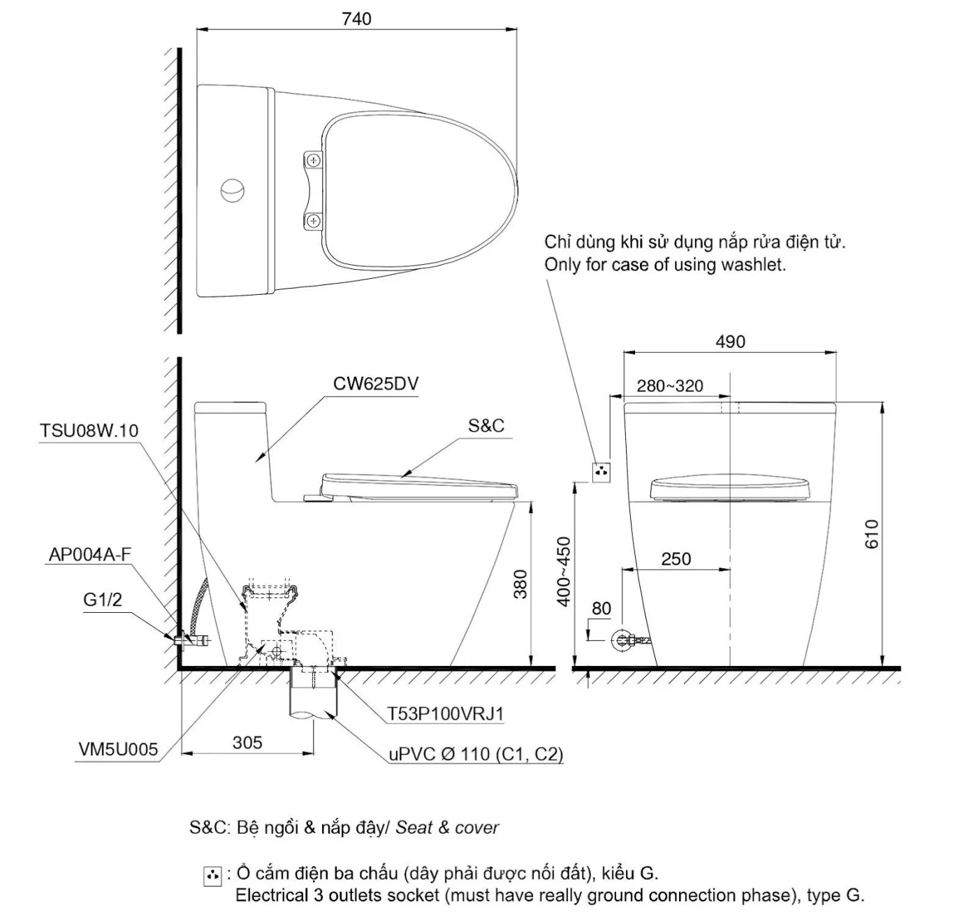 1. Thông số kỹ thuật bồn cầu 1 khối TOTO MS625DT8