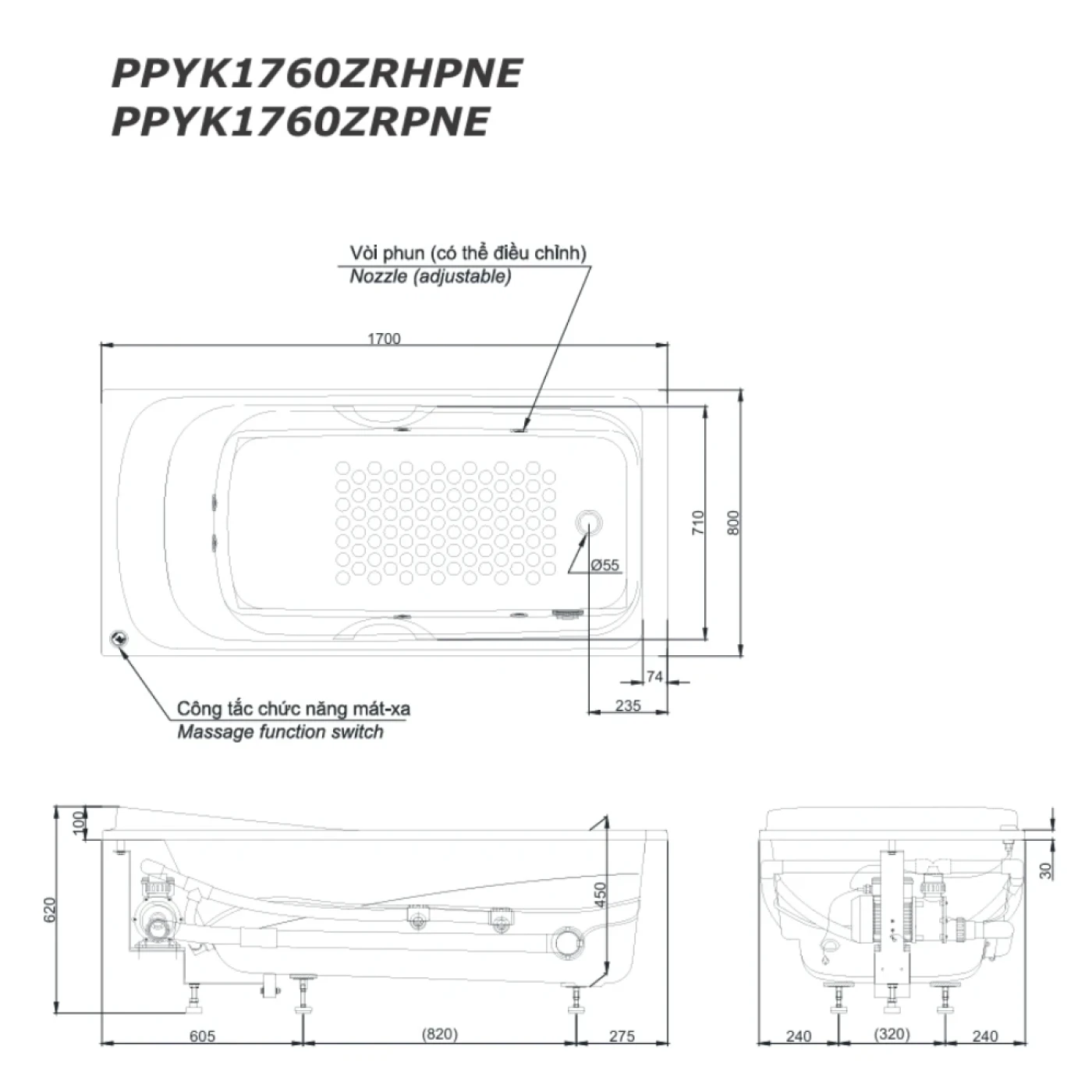 Chi tiết bồn tắm TOTO PPYK1760ZRHPNE/TVBF412/DB505R-2B