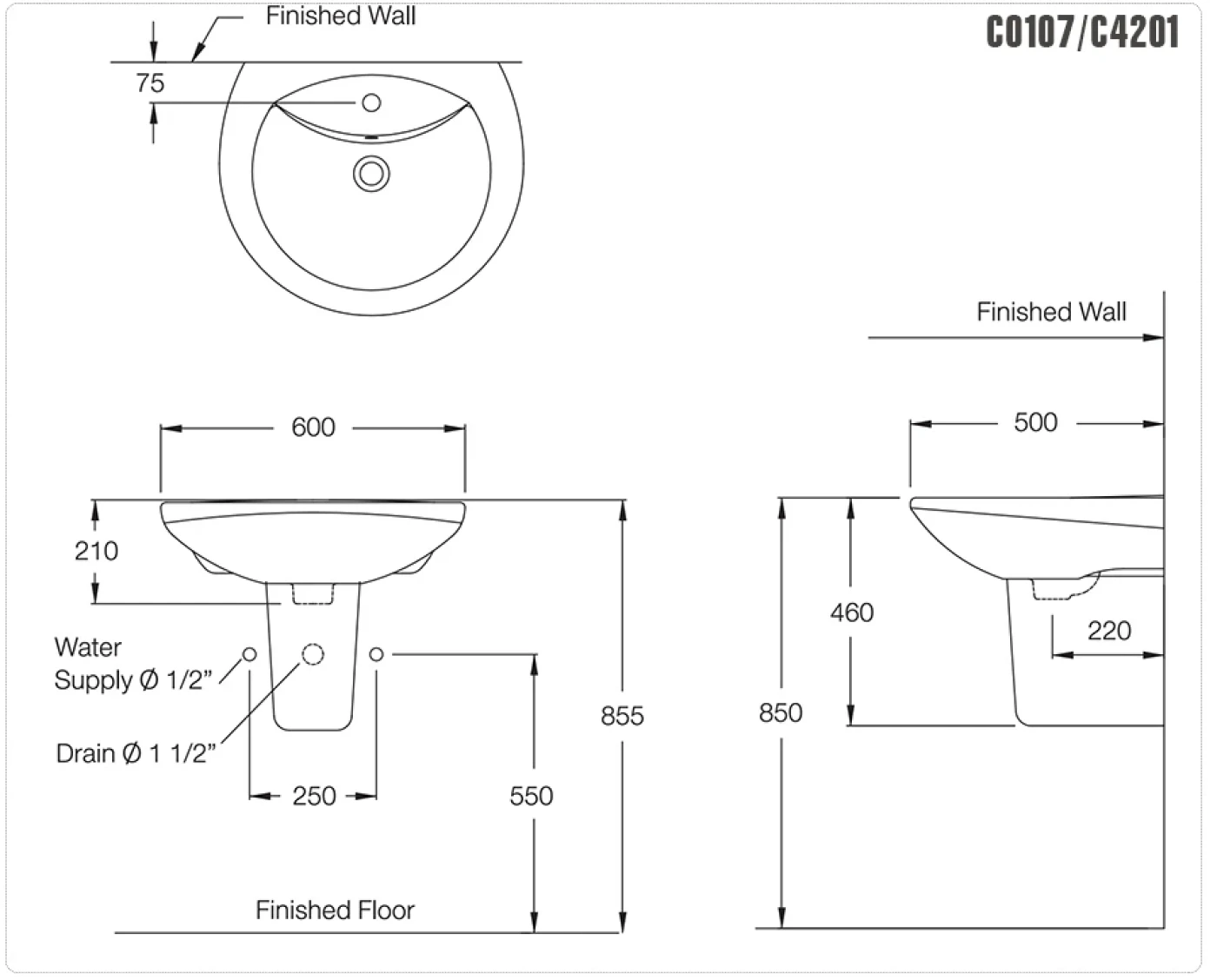 Bản vẽ kỹ thuật chậu rửa treo tường Cotto C0107+C4201
