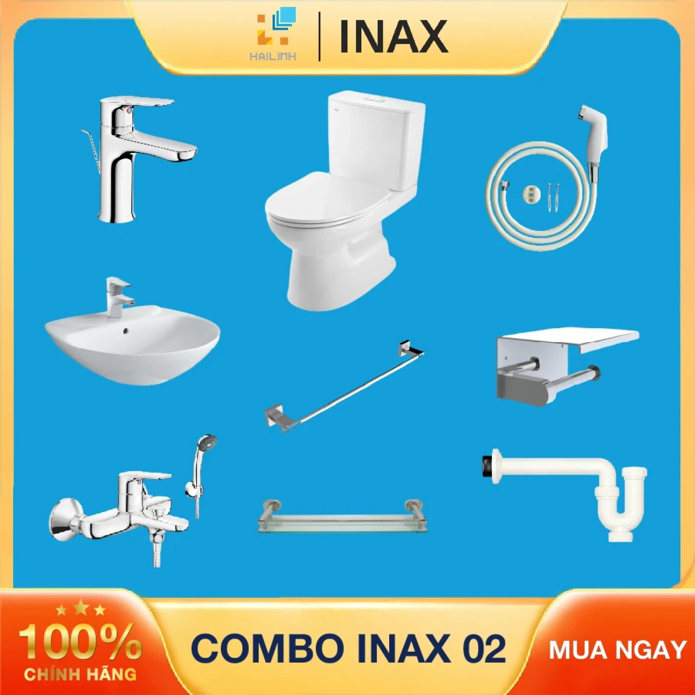 Combo thiết bị vệ sinh Inax + Belli số 2 được giới thiệu ngay sau đây gồm 9 sản phẩm cơ bản đáp ứng tốt nhu cầu người tiêu dùng. 100% sản phẩm chính hãng, mua đồng bộ lại có giá giảm cực sâu. Nhanh tay chớp ngay cơ hội mua trọn bộ thiết bị vệ sinh Inax kết hợp với phụ kiện Belli siêu ưu đãi này nhé!