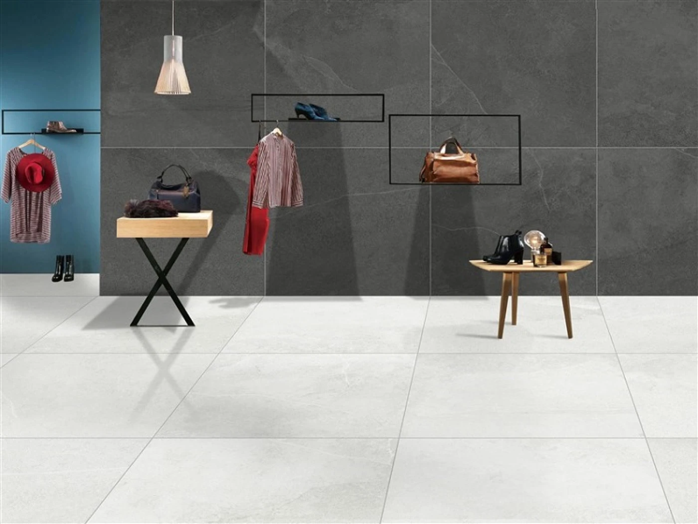 - Sự kết hợp của họa tiết vân đá ẩn hiện trên nền gạch màu ghi đen giúp không gian thêm ấn tượng và nổi bật hơn, khẳng định đẳng cấp riêng biệt cho công trình.