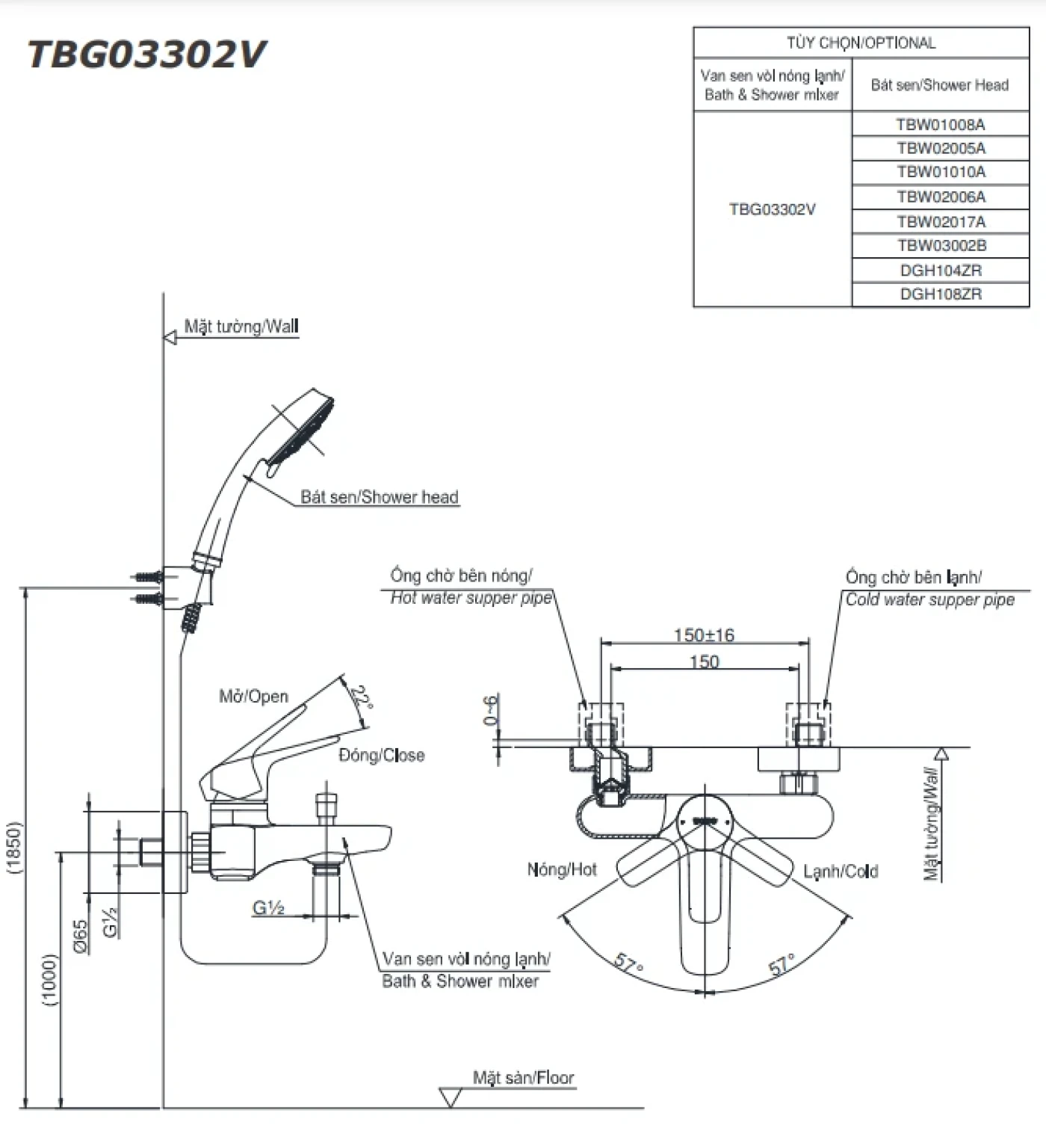 1. Thông số kỹ thuật sen tắm nóng lạnh TOTO TBG03302VA/TBW02006V