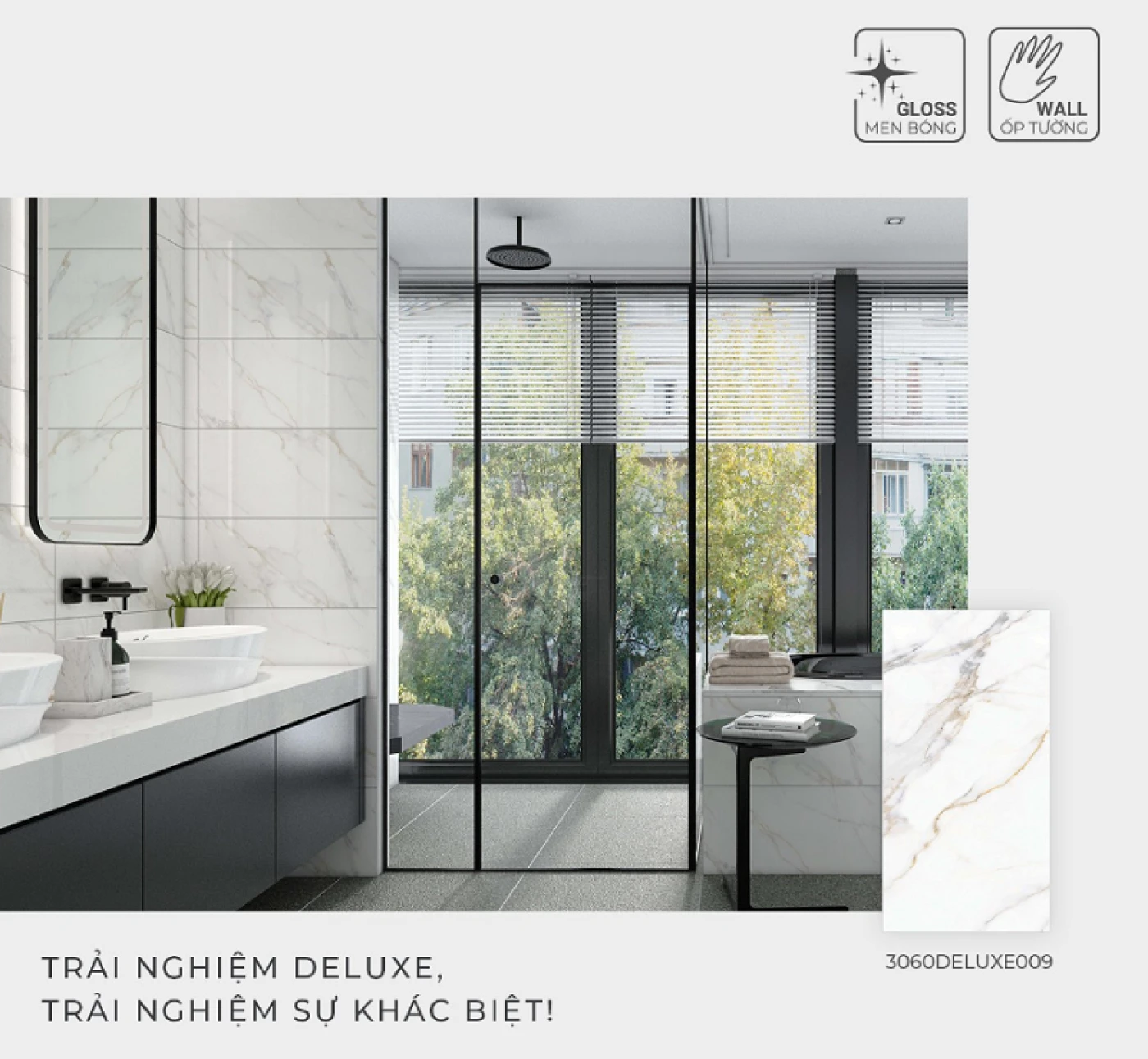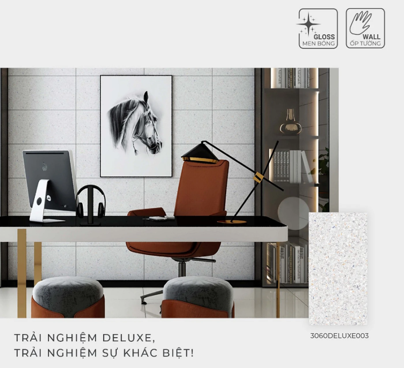 BST Deluxe sang trọng hơn với bề mặt men nhẵn bóng, tạo nên bề mặt ốp siêu láng mịn, dễ dàng vệ sinh lau chùi. Dù ứng dụng trong không gian nào phòng khách, phòng bếp hay nhà tắm thì đều luôn sạch sẽ, sáng bóng và không sợ bám bẩn. Đặc biệt nếu gia đình có trẻ nhỏ thi thoảng lại xuất hiện những hình thù ngộ nghĩnh từ bút sáp màu thì sử dụng gạch men bóng Deluxe sẽ thật đơn giản để xóa chúng, bé thoải mái vui chơi, bố mẹ nhàn tênh.