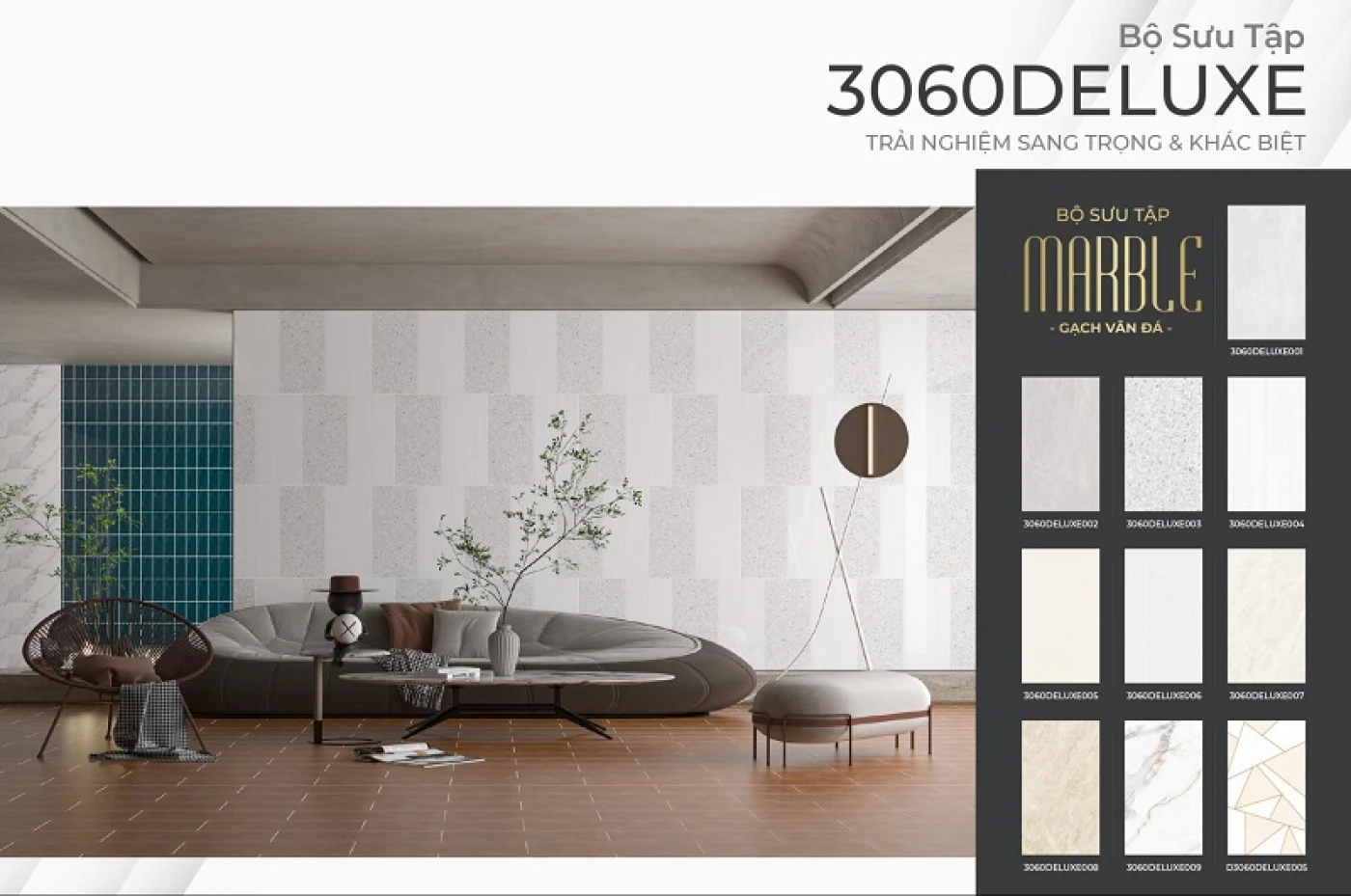 Bộ sưu tập Deluxe bao gồm 9 mẫu gạch với 2 tông màu sắc chủ đạo trung tính, trang nhã với hoa văn vân đá mang đến cho gia chủ những lựa chọn mới mẻ, đa dạng.