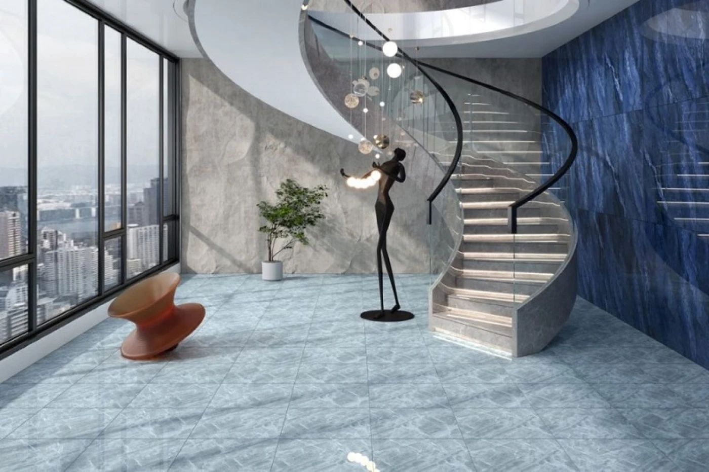 Gạch PORCELAIN 6060TRANGAN001-FP, vân đá màu xám xanh, men bóng ứng dụng lát nền tiền sảnh khách sạn 5 sao.