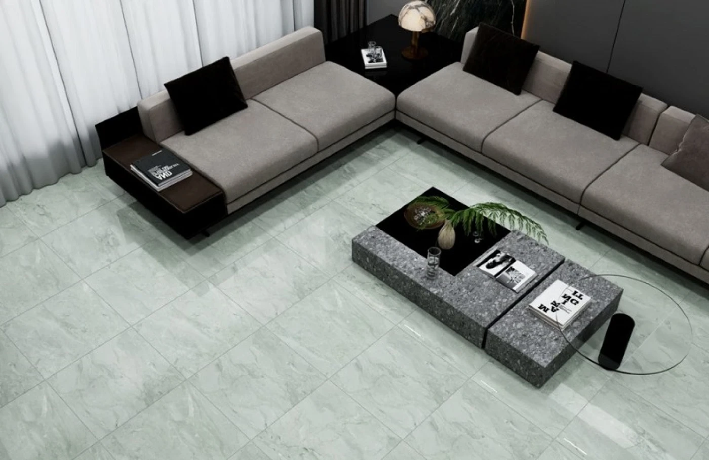 GẠCH PORCELAIN 6060TRANGAN003-FP vân đá xám xanh nhạt, men bóng lát nền phòng khách tối giản.