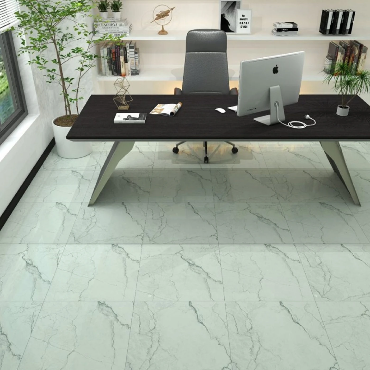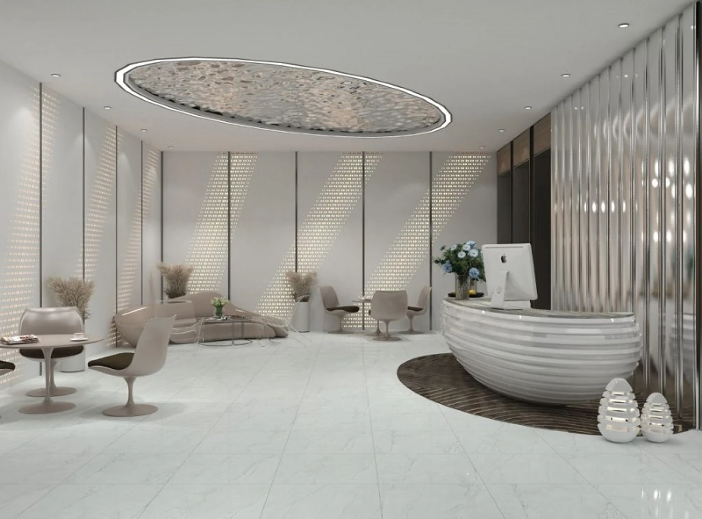 GẠCH PORCELAIN 6060TRANGAN006-FP vân đá trắng men bóng lát tiền sảnh khách sạn.