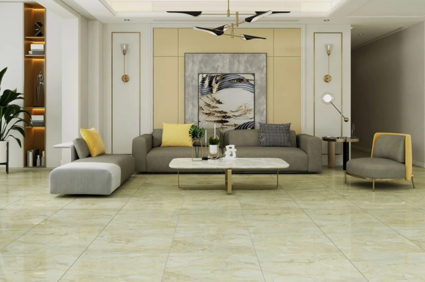 Gạch PORCELAIN 6060TRANGAN002-FP, vân đá màu kem nâu, men bóng lát nền phòng khách biệt thự hiện đại.