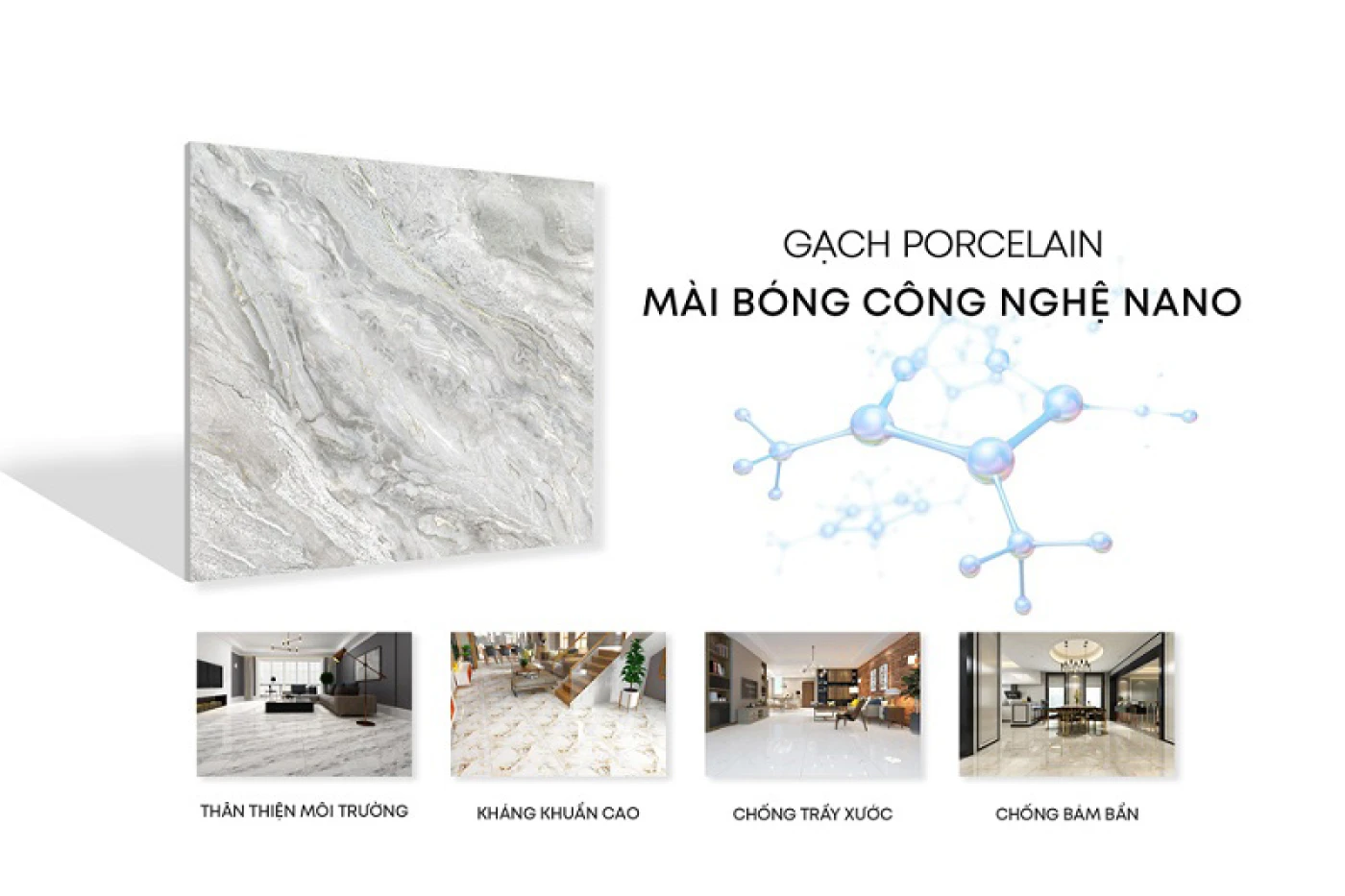 Kết cấu xương Porcelain bền chắc kết hợp với công nghệ Nano mài bóng, gạch có nhiều ưu điểm: