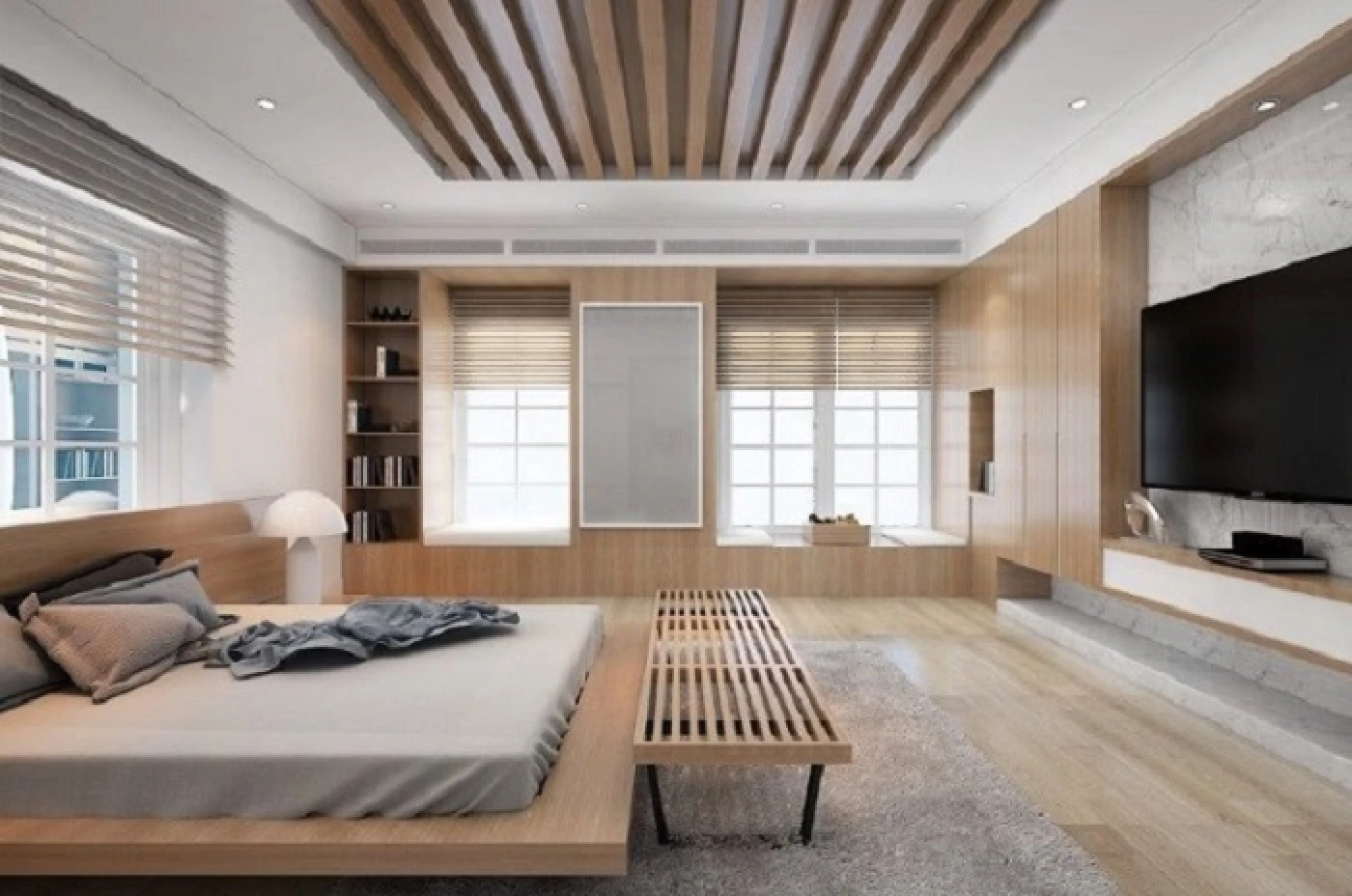 Đón đầu xu hướng 2023 phải kể đến những mẫu trần thạch cao ốp gỗ, mang đến vẻ đẹp tự nhiên, gần gũi và không kém phần sang trọng cho không gian. Đây là loại trần thạch cao kết hợp sử dụng một lớp gỗ phủ để gia tăng hiệu ứng trang trí, phù hợp với mọi thiết kế không gian khác nhau từ cổ điển đến hiện đại.