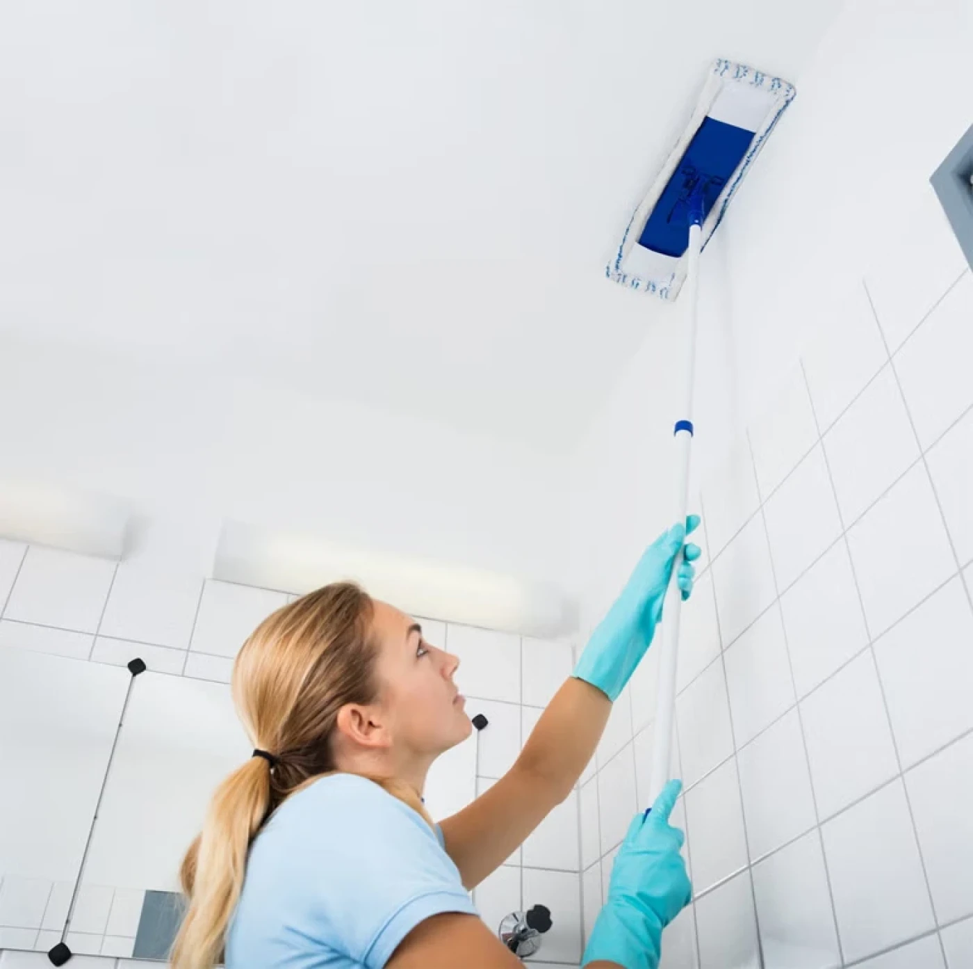Bạn nên bắt đầu từ điểm cao nhất để bụi bẩn không rơi xuống các khu vực đã làm sạch phía dưới. Hãy dùng chổi lông gà hoặc máy hút bụi đầu dài để quét sạch bụi xi măng trên trần và các đường phào chỉ trang trí. Đối với tường nhà, hãy dùng khăn ẩm lau nhẹ nhàng các vết bụi bám, riêng các vết bẩn cứng đầu có thể xử lý bằng dung dịch tẩy rửa nhẹ để không làm hỏng màu sơn.