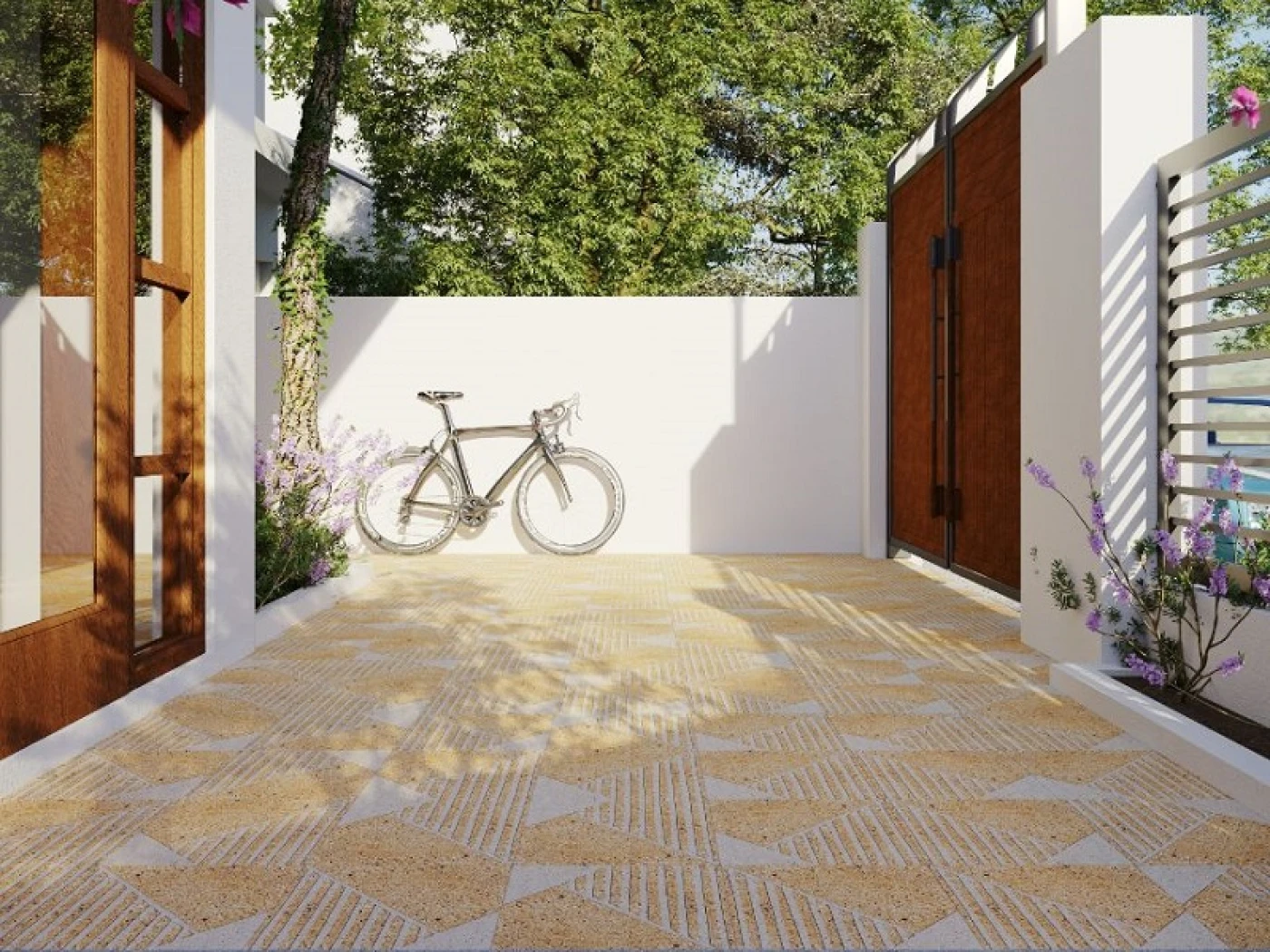 Mẫu gạch 4040LYSON008 màu kem đậm, men mờ, bề mặt họa tiết hình học độc đáo lát sân trước biệt thự.