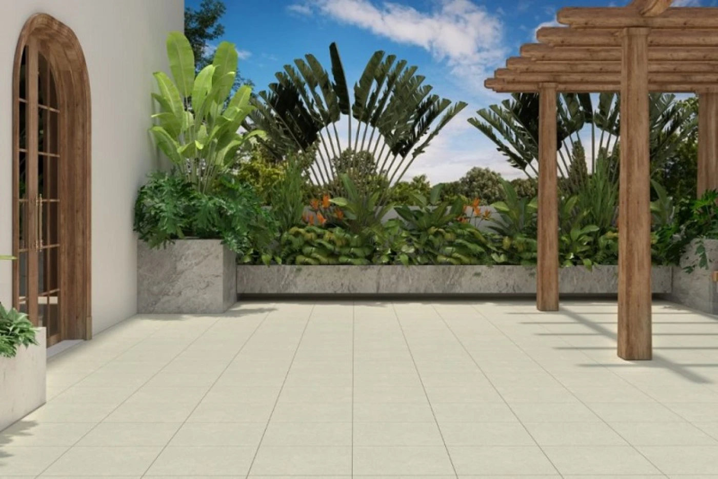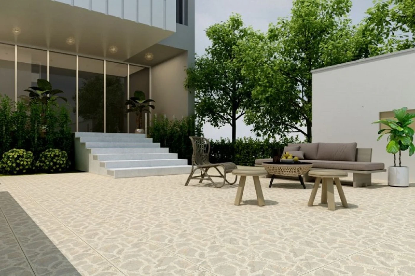 Mẫu gạch 4040LYSON005 màu kem, in men khô chống trơn lát sân thượng của biệt thự không gian mở.