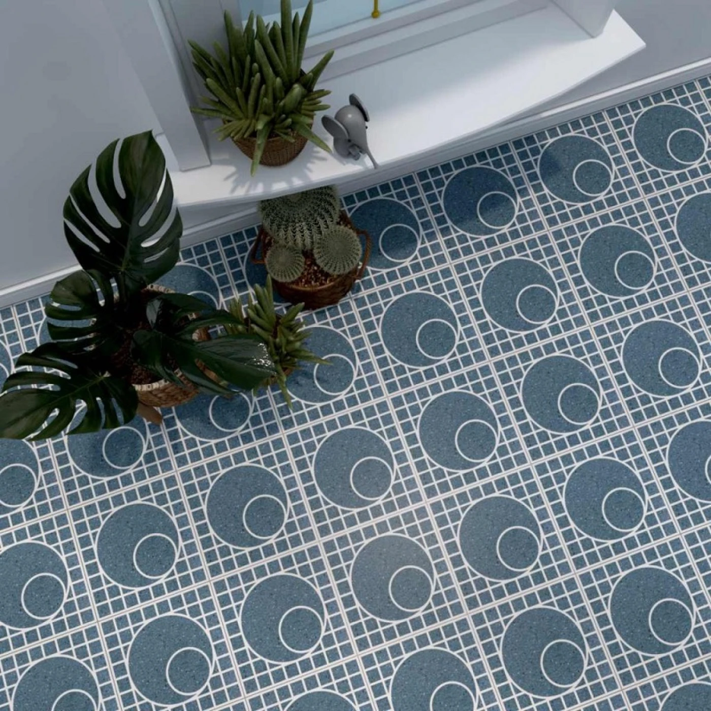 Mẫu gạch Porcelain 4040LYSON008 màu xám xanh, men mờ, bề mặt in kỹ thuật số họa tiết đường tròn mềm mại ứng dụng lát sân nhà.