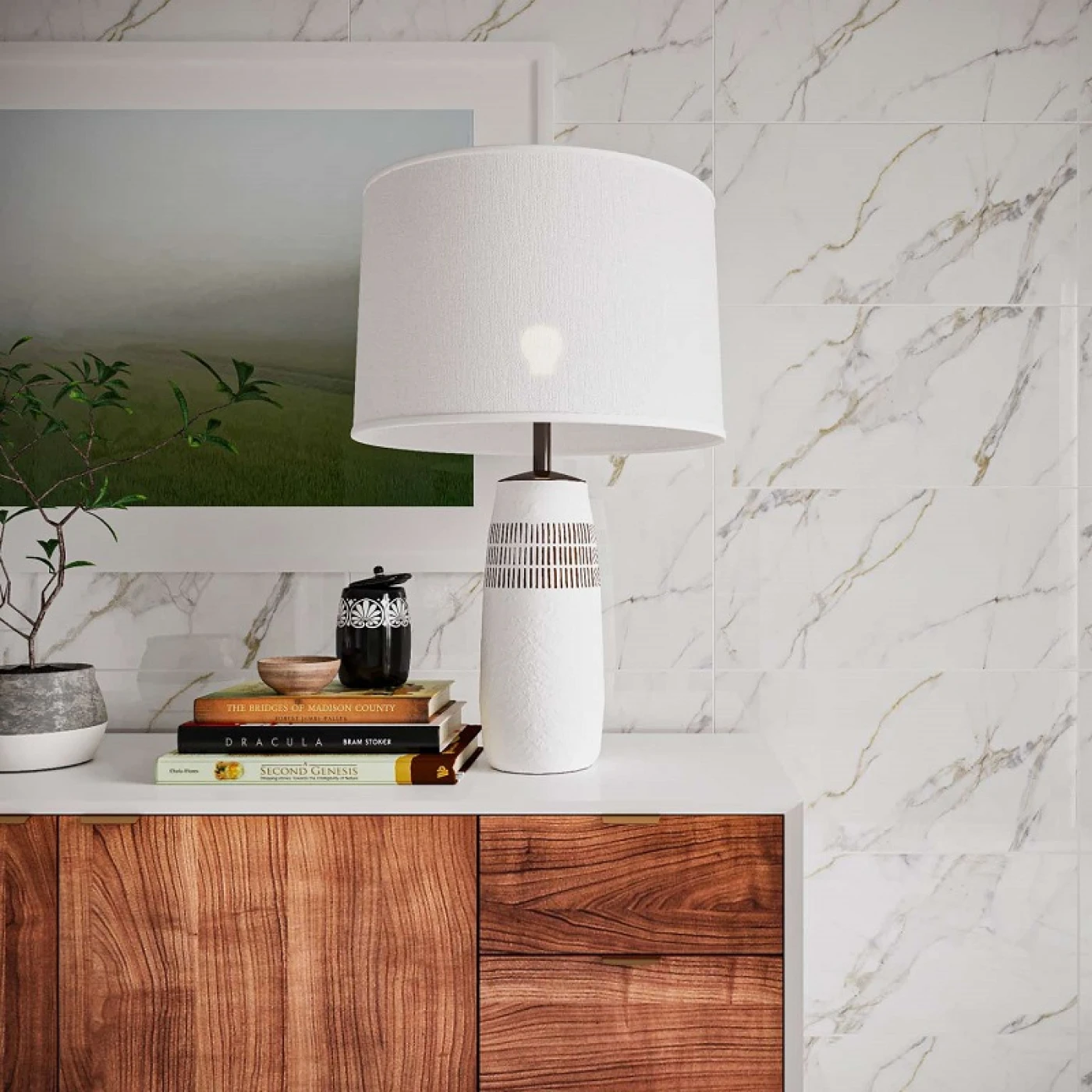 Một góc tường phòng khách trang nhã với gạch ốp tường 3060CARARAS001 vân đá marble xám nhạt, mảnh nhẹ, mềm mại trên nền gạch trắng ngà