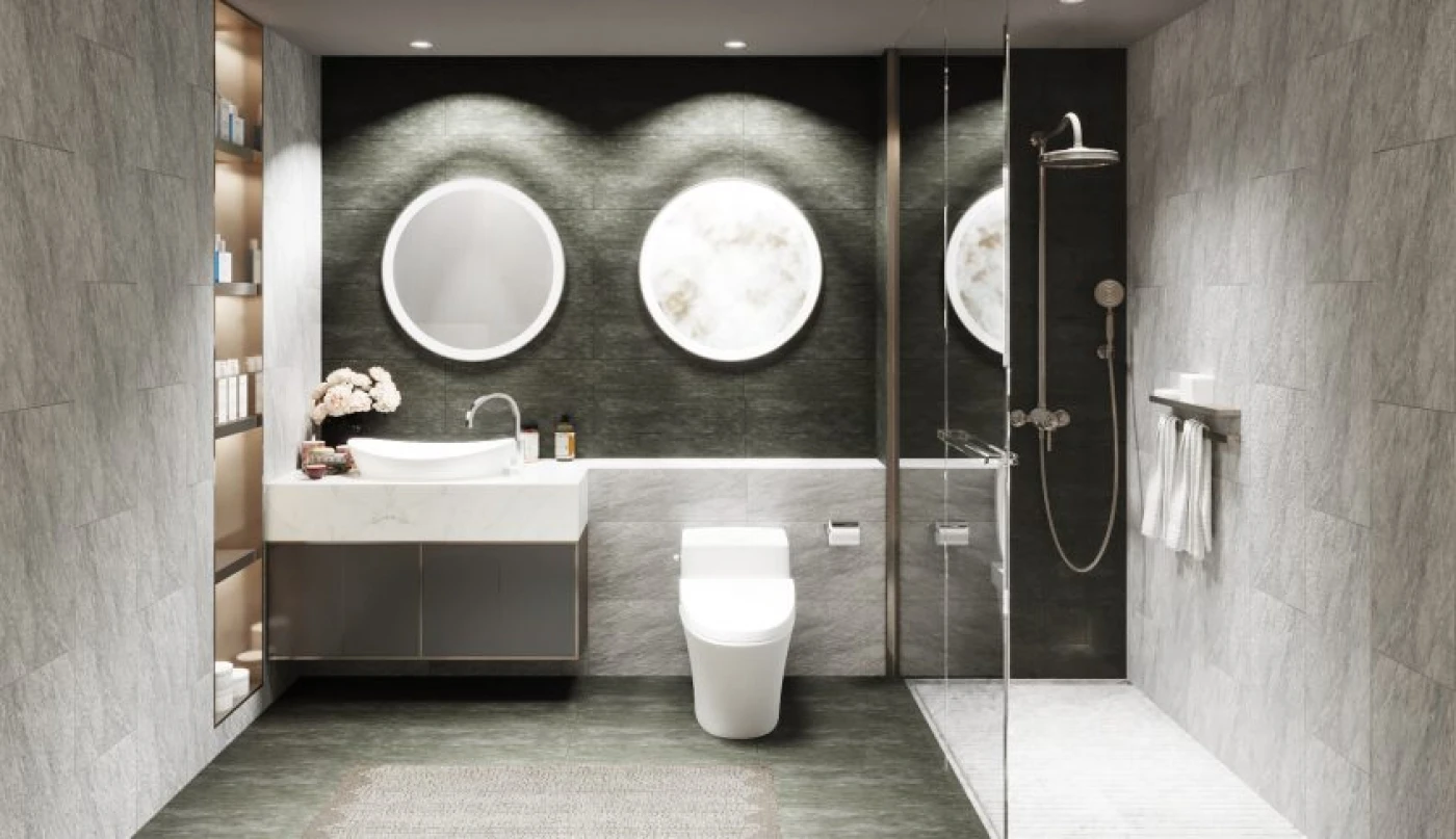 Diện tích lớn, không thiết kế cầu kỳ nhưng với sự phân khu khô ướt hợp lý kết hợp ứng dụng gạch ốp tường 3060GECKO003 màu xám tối giản mang đến cho không gian phòng tắm sự hiện đại, thời thượng tối ưu.