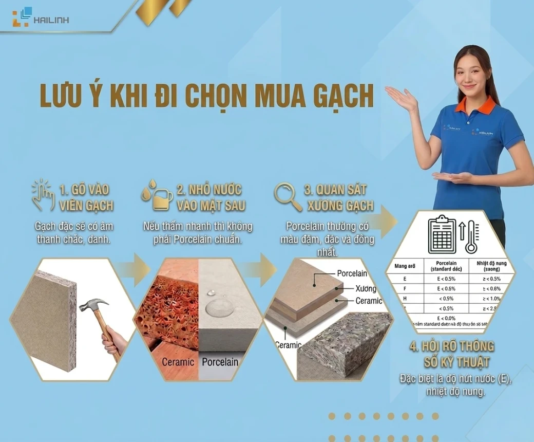 Nguyên tắc cốt lõi khi mua gạch: đừng chỉ dựa vào tên gọi trên bao bì, hãy hỏi và kiểm tra thông số kỹ thuật thực tế.