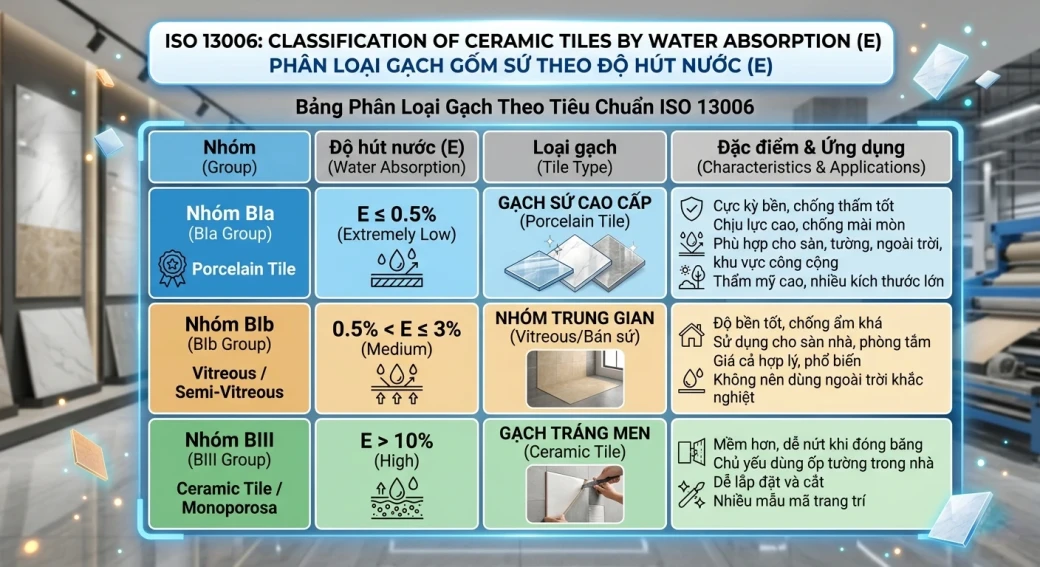 Trên thế giới, theo tiêu chuẩn ISO 13006, gạch không được phân loại bằng những cái tên “mỹ miều” như Granite hay bán sứ, mà dựa trên độ hút nước (E):